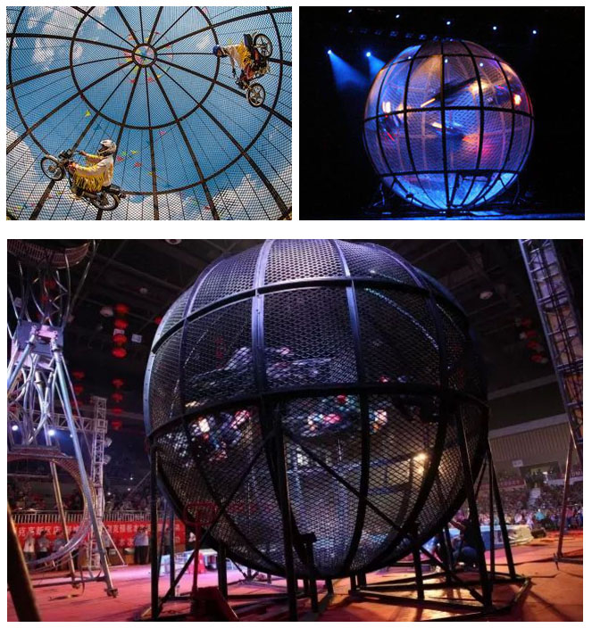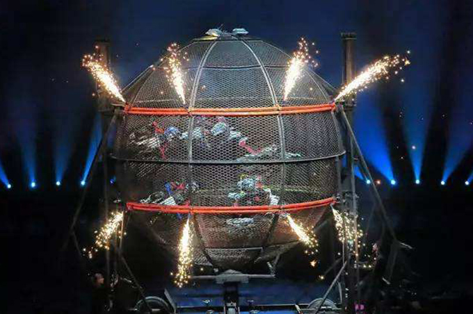 【簡介】: 環(huán)球飛車是一場將在直徑只有6.5米乃至僅有4.5米的圓形鐵球內(nèi),2至8輛摩托車以每小時(shí)80公里的速度完成交叉穿越,90°飛行,360°旋轉(zhuǎn)等高難度動(dòng)作,兩車最小間距僅50cm,時(shí)間不能相差0.01s,心跳值狂飆,視覺效果驚悚的摩托特技秀。