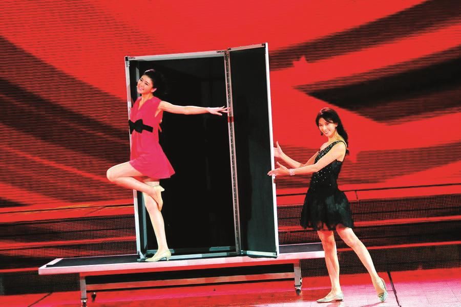2011年央視春晚劉亭婷(左)驚艷出場(chǎng)與林志玲同臺(tái)破解“魔術(shù)”